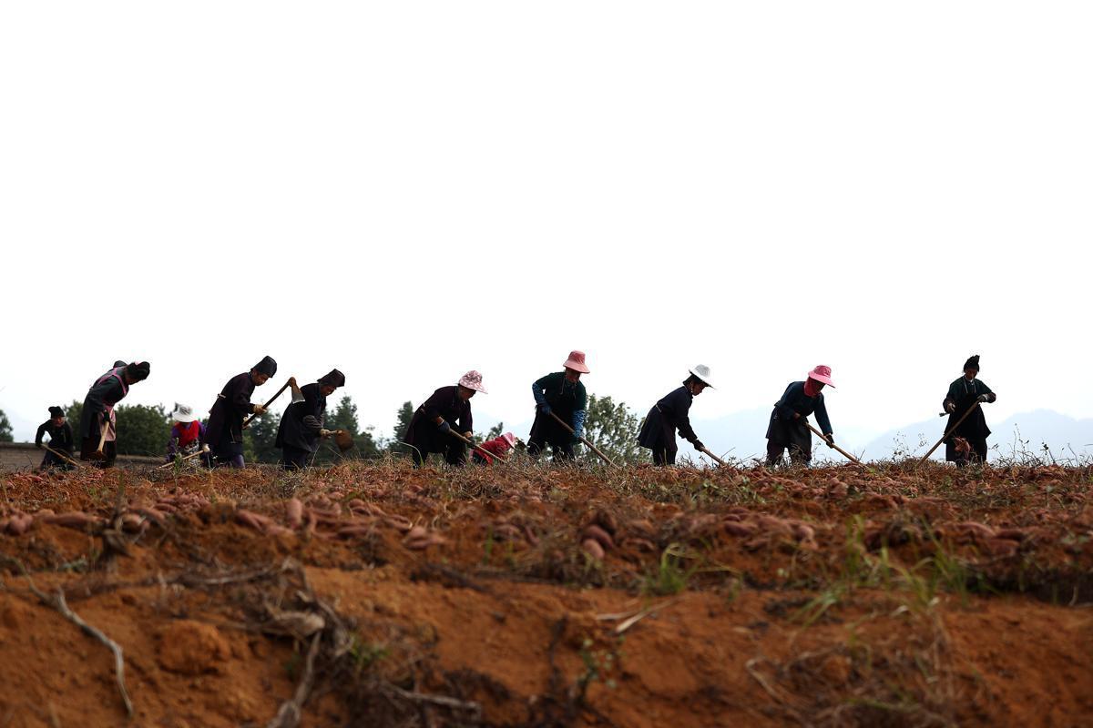 À l'approche d'une vague de froid, les agriculteurs mettent les bouchées doubles pour récolter des patates douces dans les champs du comté de Danzhai, dans la préfecture autonome Miao et Dong de Qiandongnan de la province du Guizhou (sud-ouest de la Chine).