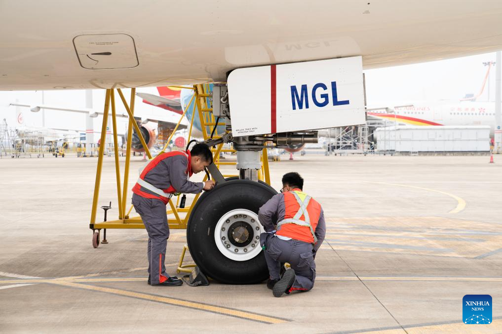 Des membres du personnel de Grand China Aviation Maintenance Co., Ltd. (GCAM) examinent un avion entrant dans la base de maintenance d'aéronefs à guichet unique du Port de libre-échange de Hainan, à Haikou, dans la province chinoise de Hainan (sud), le 16 janvier 2025. Cet avion bénéficiera de services d'examen et de maintenance, marquant la première commande de maintenance d'avions entrants au Port de libre-échange de Hainan pour l'année 2025 ainsi que le premier de ces services pour un avion en provenance de Mongolie.