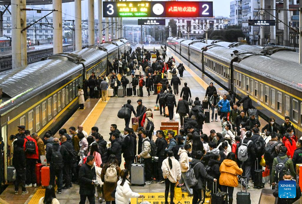 Des passagers font la queue pour monter à bord de leur train à la gare de Wuchang à Wuhan, capitale de la province du Hubei (centre de la Chine), le 25 janvier 2025. (Hu Xuejun / Xinhua)