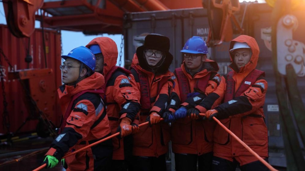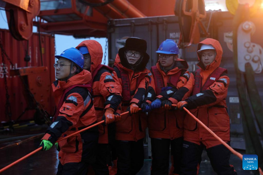 Les membres de la 41e expédition chinoise en Antarctique travaillent à bord du brise-glace de recherche chinois Xuelong-2 (« Dragon de neige »). Celui-ci mène une étude d’un mois sur l’écosystème marin de la mer d’Amundsen, comprenant une enquête et un suivi complets de l’eau, de l’environnement biologique, sédimentaire et atmosphérique, ainsi que de la distribution des polluants. [Crédit photo: Xinhua/Huang Taoming]