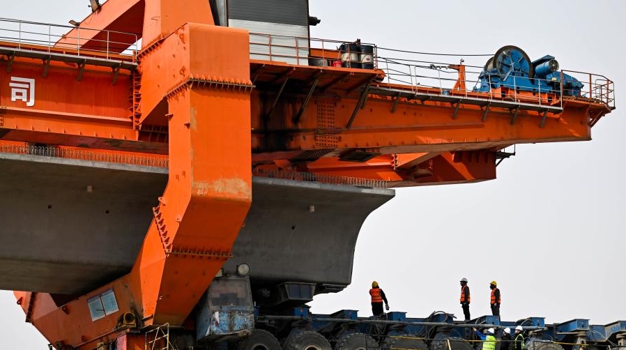 Des ouvriers travaillent sur le chantier de construction du Grand pont de Heyuancun de la ligne à grande vitesse Baotou-Yinchuan, dans la région autonome de Mongolie intérieure (nord de la Chine), le 6 mars 2025. Le pont de Heyuancun a été fermé avec succès le 6 mars, marquant l'achèvement des ponts et des tunnels de la section de Mongolie intérieure de la ligne à grande vitesse reliant Baotou, en Mongolie intérieure, à Yinchuan, dans la région autonome Hui du Ningxia (nord-ouest de la Chine). (Li Zhipeng / Xinhua)