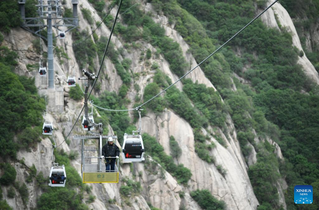 Shaanxi : des agents de maintenance assurent la sécurité du téléphérique touristique du mont Huashan