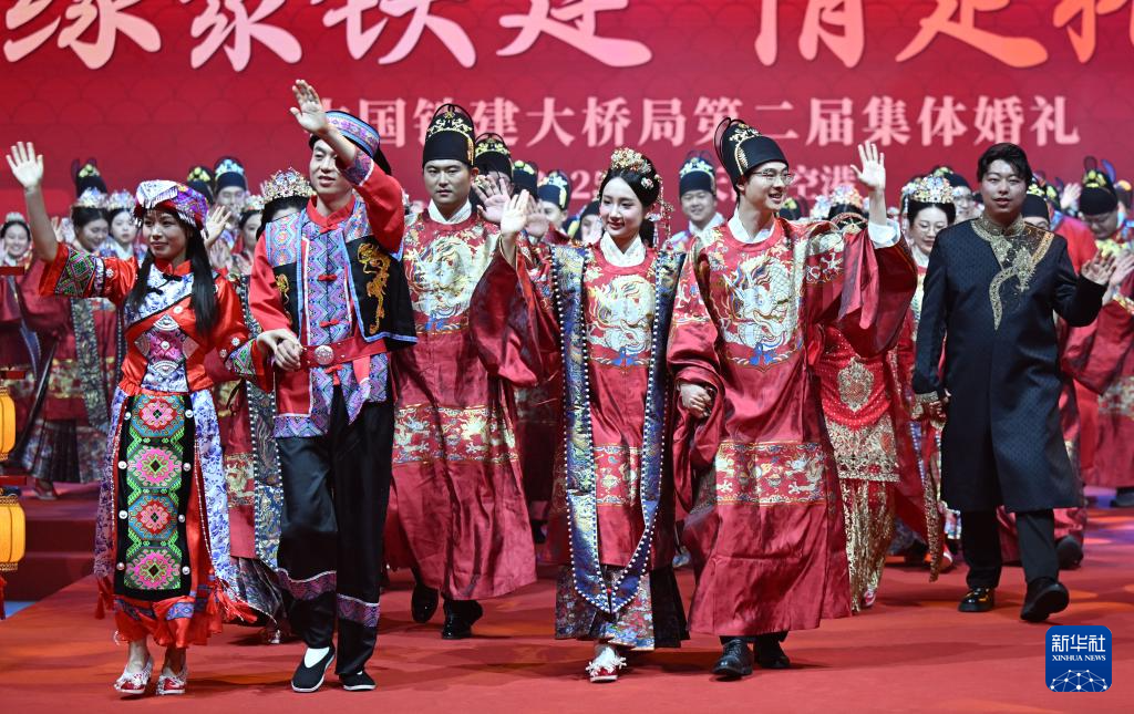 Vêtus de costumes traditionnels chinois, quarante-six couples du groupe China Railway Construction Bridge Engineering Bureau se sont dit « oui » lors d’une cérémonie de mariage de groupe qui s’est tenue le 21 mai à Tianjin (nord). En présence de leurs proches et amis, les couples ont participé à plusieurs activités rituelles telles que « S’incliner devant le ciel et la terre », « Nouer les cheveux » et « Boire du vin en coupes croisées dans le verre de l'autre », mettant en lumière leur engagement solennel envers le mariage.