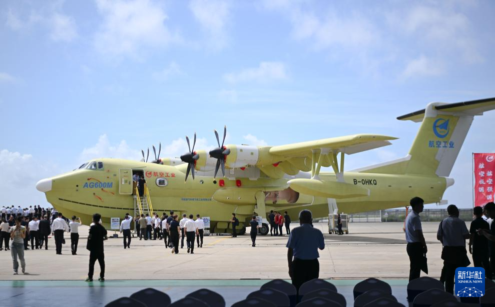 Photo prise le 11 juin, montrant le premier avion AG600 à être sorti de la chaîne de production en série à Zhuhai, dans la province du Guangdong (sud). L'avion AG600, premier grand avion civil à usage spécial conçu en Chine selon les normes et réglementations de navigabilité de l'aviation civile, a obtenu le 11 juin sa licence pour débuter sa production de masse.