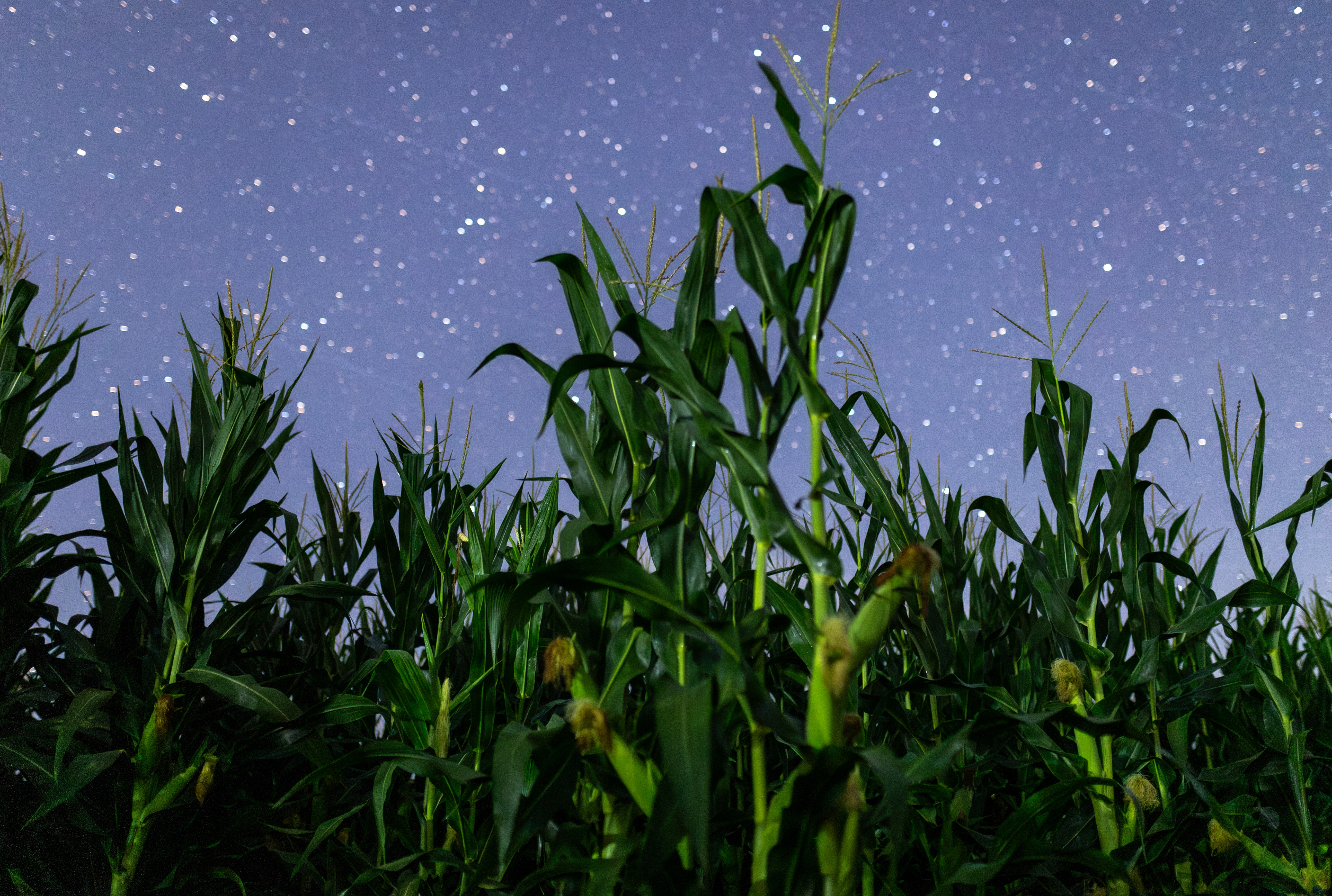 Photo prise le 2 août 2025, montrant un champ de maïs sous un ciel étoilé, près de Jiamusi, dans la province du Heilongjiang (nord-est). Dans cette province surnommée « le grenier à céréales de la Chine », diverses cultures agricoles sont récemment entrées en phase de maturation.