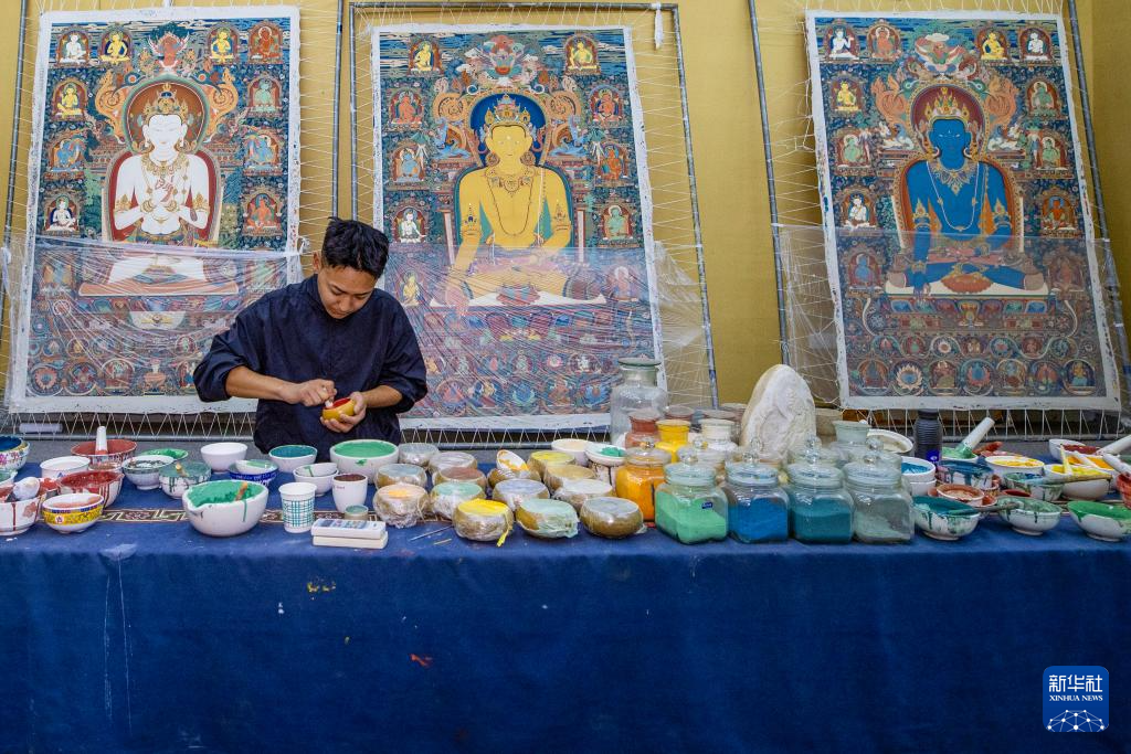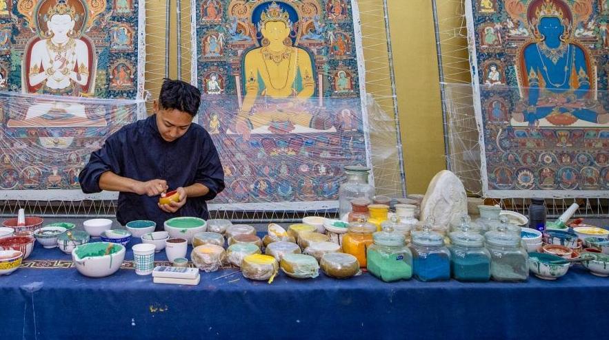 Photo : Le 6 août, un peintre fabrique des pigments minéraux pour une peinture thangka.