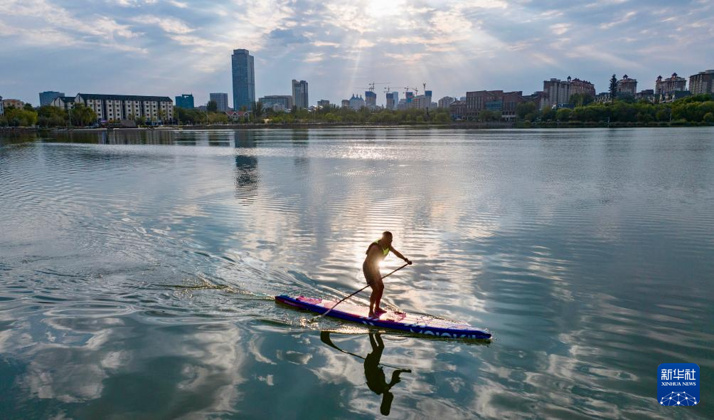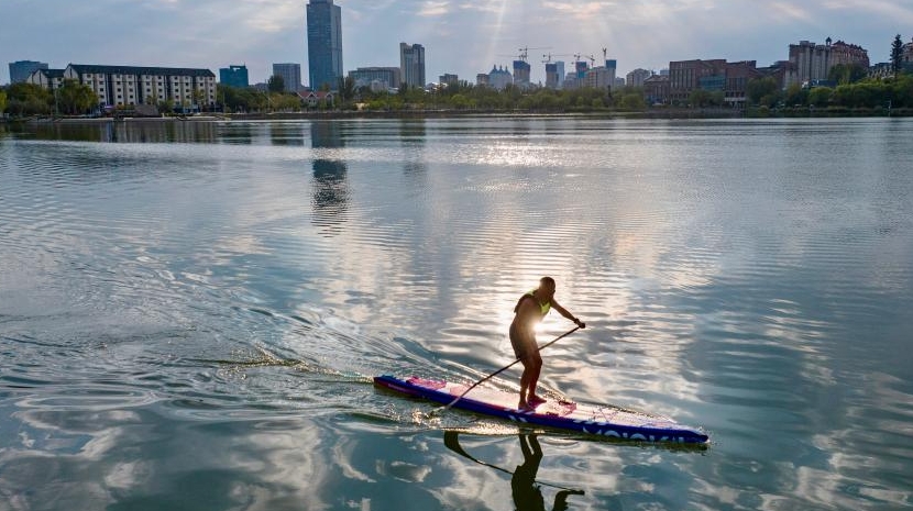 Des habitants pratiquent des sports nautiques au parc Haibao, à Yinchuan. Photo prise le 17 septembre.
