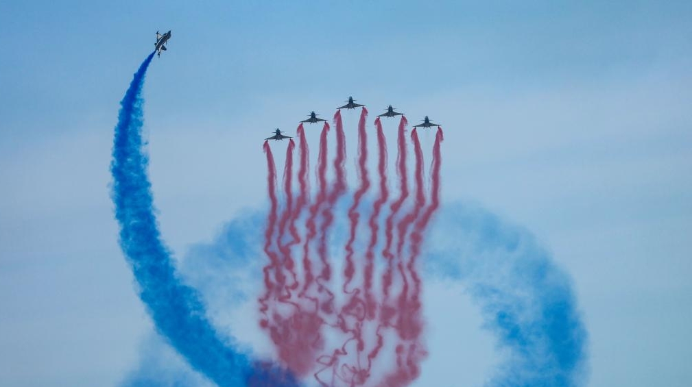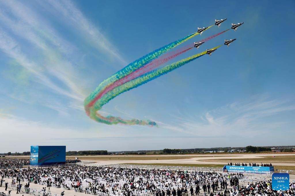 Des avions de l'équipe de voltige Bayi de l'Armée de l'air de l'Armée populaire de libération (APL) ont effectué un vol lors de la Journée portes ouvertes de l'aviation 2025 de l'Armée de l'air de l'APL et du Salon aéronautique de Changchun, à Changchun, dans la province du Jilin (nord-est), le 23 septembre 2025. Les deux événements ont pris fin le même jour.