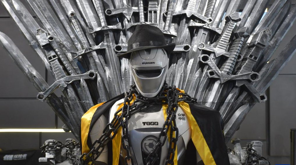 Un robot humanoïde d'EngineAI, une start-up spécialisée en robotique, est exposé dans un magasin de robotique 6S à Shenzhen, dans la province chinoise du Guangdong (sud), le 28 octobre 2025. (Xinhua/Liu Lihang)