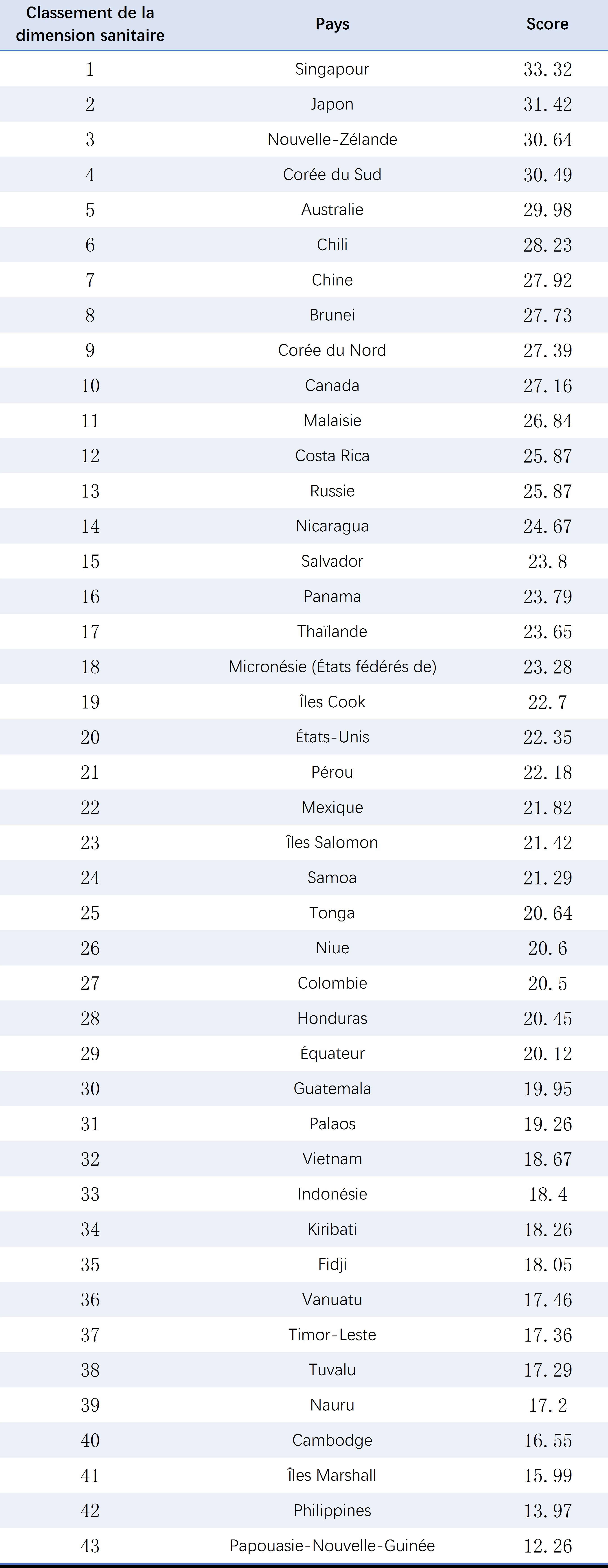 Singapour s'est classé premier, avec un score de 33,32 ; le Japon s'est classé deuxième, avec un score de 31,42 ; la Nouvelle-Zélande s'est classée troisième, avec un score de 30,64 ; la Corée du Sud s'est classée quatrième, avec un score de 30,49 ; l'Australie s'est classée cinquième, avec un score de 29,98 ; le Chili s'est classé sixième, avec un score de 28,23 ; la Chine s'est classée septième, avec un score de 27,92 ; Brunei se classe huitième, avec un score de 27,73 ; la Corée du Nord se classe neuvième, avec un score de 27,39 ; et le Canada dixième, avec un score de 27,16. Le classement des dix premiers pays est resté relativement stable, avec peu de changements par rapport à l'année dernière. Six de ces pays sont situés en Asie, deux en Océanie et deux dans les Amériques. Les dix derniers pays sont toujours principalement des États insulaires du Pacifique, les autres se trouvant en Asie. Il convient de noter que le score de la Corée du Nord est passé de 22,81 en 2024 à 27,39 en 2025, son classement ayant fait un bond significatif de la 19e à la 9e place, , ce qui représente un progrès remarquable.. Cette amélioration est attribuée à une augmentation de son score de ressources médicales par habitant de 0,57 à 3,25, et à une amélioration de son score de prévention et de contrôle des maladies infectieuses de 8,1 à 10. Le classement des États-Unis est passé de la 13e à la 20e place, avec un score passant de 24,55 à 22,35, principalement en raison d'une diminution de son score de ressources médicales par habitant de 5 à 2,02. Suggestion de la dimension sanitaire: La région du Pacifique a globalement amélioré sa capacité à protéger la vie et la santé des individus, mais les niveaux restent faibles, en particulier dans les nations insulaires du Pacifique.
