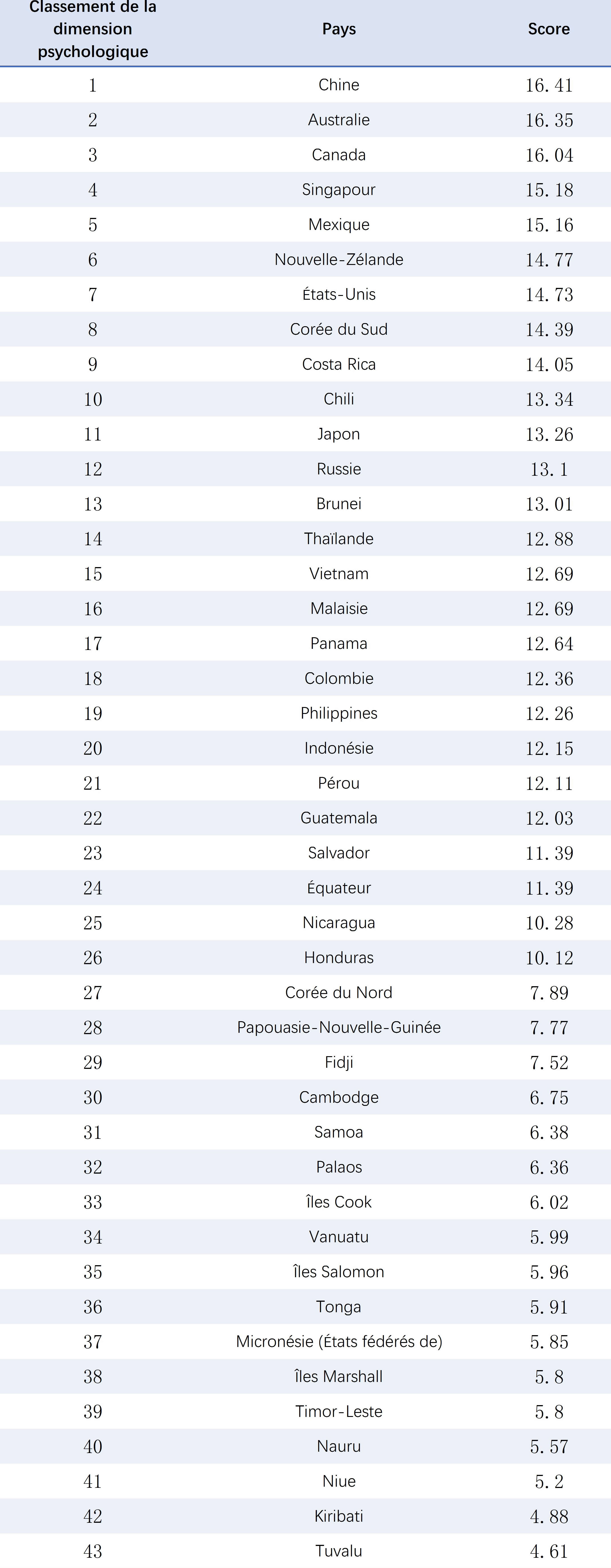 La Chine s'est classée première, avec un score de 16,41 ; deuxième, l'Australie, avec un score de 16,35 ; troisième, le Canada, avec un score de 16,04 ; quatrième, Singapour, avec un score de 15,18 ; cinquième, le Mexique, avec un score de 15,16 ; sixième, la Nouvelle-Zélande, avec un score de 14,77 ; septième, les États-Unis, avec un score de 14,73 ; huitième, la Corée du Sud, avec un score de 14,39 ; neuvième, le Costa Rica, avec un score de 14,05 ; et dixième, le Chili, avec un score de 13,34. Parmi les dix premiers pays, trois se trouvent en Asie, deux en Océanie et cinq dans les Amériques. Parmi les dix derniers pays, neuf sont des nations insulaires du Pacifique. Le classement du Japon est passé de la 23e place en 2024, avec un score de 11,64, à la 11e en 2025, avec un score de 13,26. Cette amélioration significative est principalement due à une augmentation significative de son score de bonheur, de 6,16 à 7,87. Le classement de la Russie est passé de la 21e place en 2024, avec un score de 11,78, à la 12e place en 2025, avec un score de 13,1, également en raison d'une amélioration de son score de bonheur, de 4,93 à 6,36. Suggestion de la dimension psychologique: La plupart des pays ont vu leurs scores psychologiques diminuer par rapport à 2024, ce qui reflète probablement les défis communs auxquels est confronté le développement dans le bassin du Pacifique, qui ont eu un impact sur leurs scores dans tous les domaines. Cependant, quelques pays, comme le Japon et la Russie, ont vu leurs scores et leurs classements augmenter, démontrant leurs initiatives et réalisations positives en matière de développement.