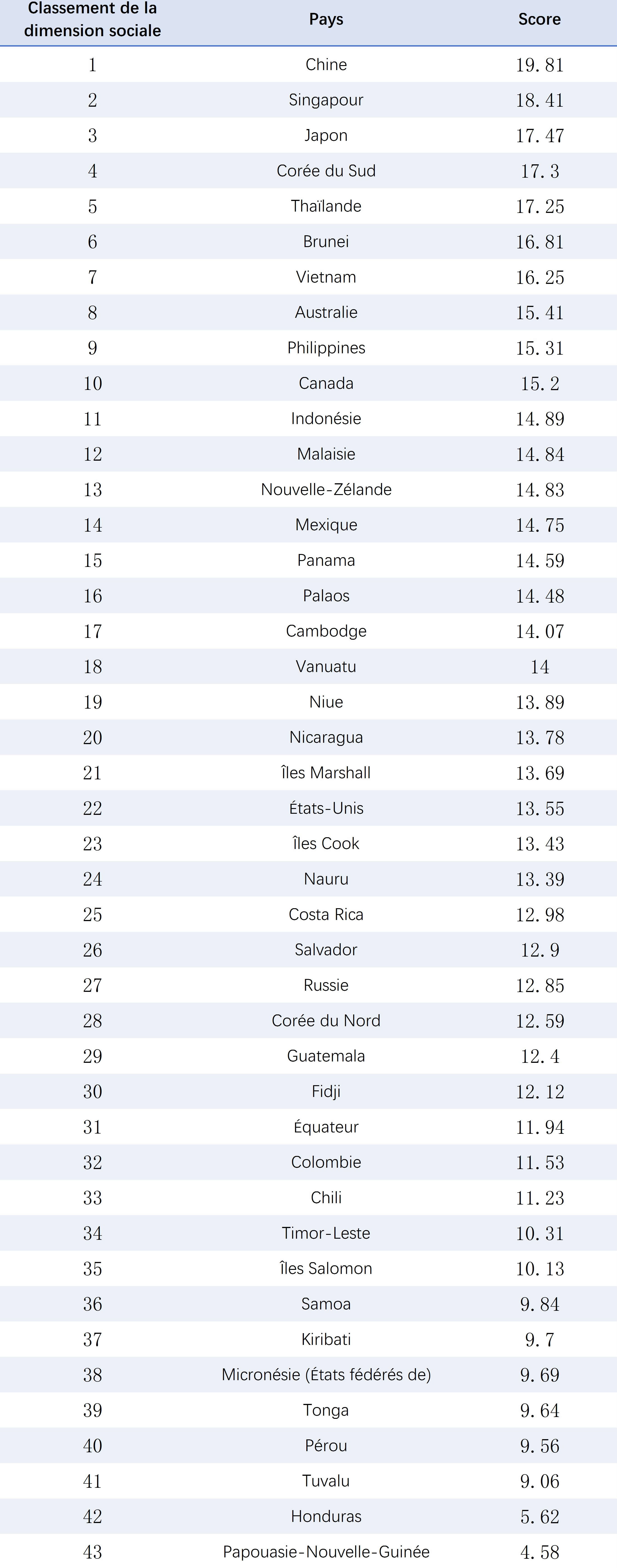 La Chine s'est classée première avec un score de 19,81 ; Singapour s'est classée deuxième avec un score de 18,41 ; le Japon s'est classé troisième avec un score de 17,47 ; la Corée du Sud s'est classée quatrième avec un score de 17,30 ; la Thaïlande s'est classée cinquième avec un score de 17,25 ; Brunei s'est classé sixième avec un score de 16,81 ; le Vietnam s'est classé septième avec un score de 16,25 ; l'Australie s'est classée huitième avec un score de 15,41 ; les Philippines s'est classée neuvième avec un score de 15,31 ; et le Canada s'est classé dixième avec un score de 15,20. Parmi les dix premiers pays, huit se trouvent en Asie, un en Océanie et un dans les Amériques. Les dix derniers pays se trouvent principalement en Océanie. La Chine, Singapour et le Japon restent en tête du classement. La Chine est arrivée en tête pendant deux années consécutives, son score passant de 19,68 en 2024 à 19,81 en 2025, consolidant encore son avance. Les États-Unis ont connu une progression significative dans leur classement, passant de la 31e place en 2024 à la 22e place en 2025, leur score passant également de 11,64 à 13,55. Suggestion de la dimension sociale : Les pays moins bien classés, comme le Honduras et la Papouasie-Nouvelle-Guinée, ont peu changé dans leur classement et leurs scores au cours des deux années, ce qui reflète le potentiel de défis importants et les progrès relativement lents du développement social de ces pays.