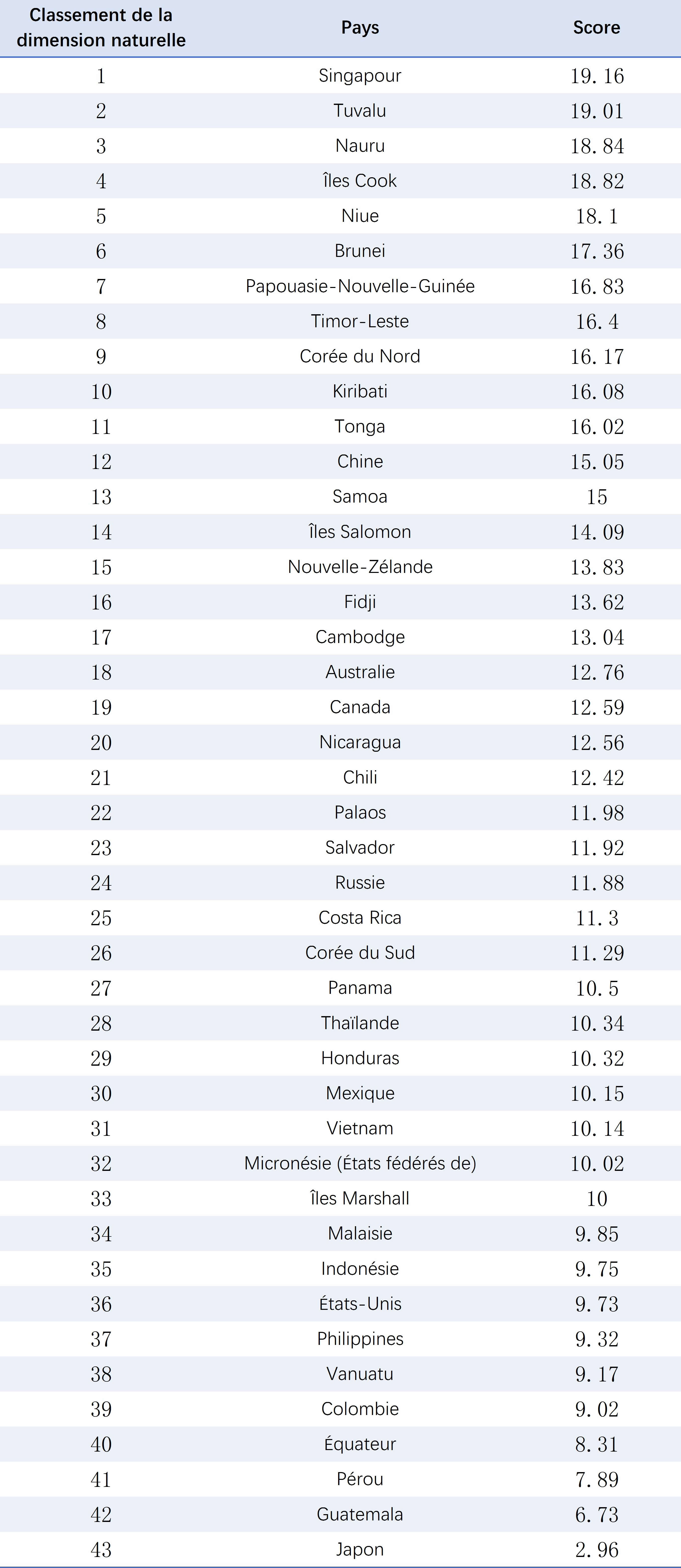 Le premier pays est Singapour avec un score de 19,16; le deuxième pays est Tuvalu avec un score de 19,01; le troisième est Nauru avec un score de 18,84; le quatrième est les Îles Cook avec un score de 18,82; le cinquième est Niue avec un score de 18,10; le sixième est Brunei avec un score de 17,36; et le septième est la Papouasie-Nouvelle-Guinée avec un score de 16,83; Le huitième pays est le Timor-Leste avec un score de 16,40; le neuvième pays est la Corée du Nord avec un score de 16,17; et le dixième pays est Kiribati avec un score de 16,08. Parmi les dix premiers pays, l'Océanie en compte sept et l'Asie trois. Les dix derniers pays du classement sont dominés par les Amériques et l'Asie. Singapour a terminé en tête des deux années, avec un score de 19,87 en 2024 et de 19,16 en 2025, inchangé malgré une baisse du score. Les petits pays comme Niue, les îles Cook et Nauru sont également en tête du classement depuis deux ans, avec des positions relativement stables. Tuvalu s'est classée 11e en 2024 et est passée à la 2e place en 2025, principalement en raison de l'amélioration de son score sur la réponse aux extrêmes climatiques, passant de 4,47 à 5,01. Le score de la Chine est passé de 12,77 en 2024 à 15,05 en 2025, passant de la 25e à la 12e place, grâce à l'amélioration des scores de la Chine en matière de réponse aux extrêmes climatiques, de réponse aux catastrophes géologiques et de réponse à la pollution de l'environnement. Palau, qui se classait 3ème en 2024, est sorti du top 10 en 2025 pour se classer 22ème, en raison de sa résilience réduite aux extrêmes climatiques, avec un score de 5,5 à-2,01. Suggestion de la dimension naturelle: Bien que le classement des dix premiers pays soit stable, les scores ont considérablement diminué et une vigilance accrue est maintenue face aux menaces que les risques de la dimension naturelle représentent pour la sécurité de la vie.