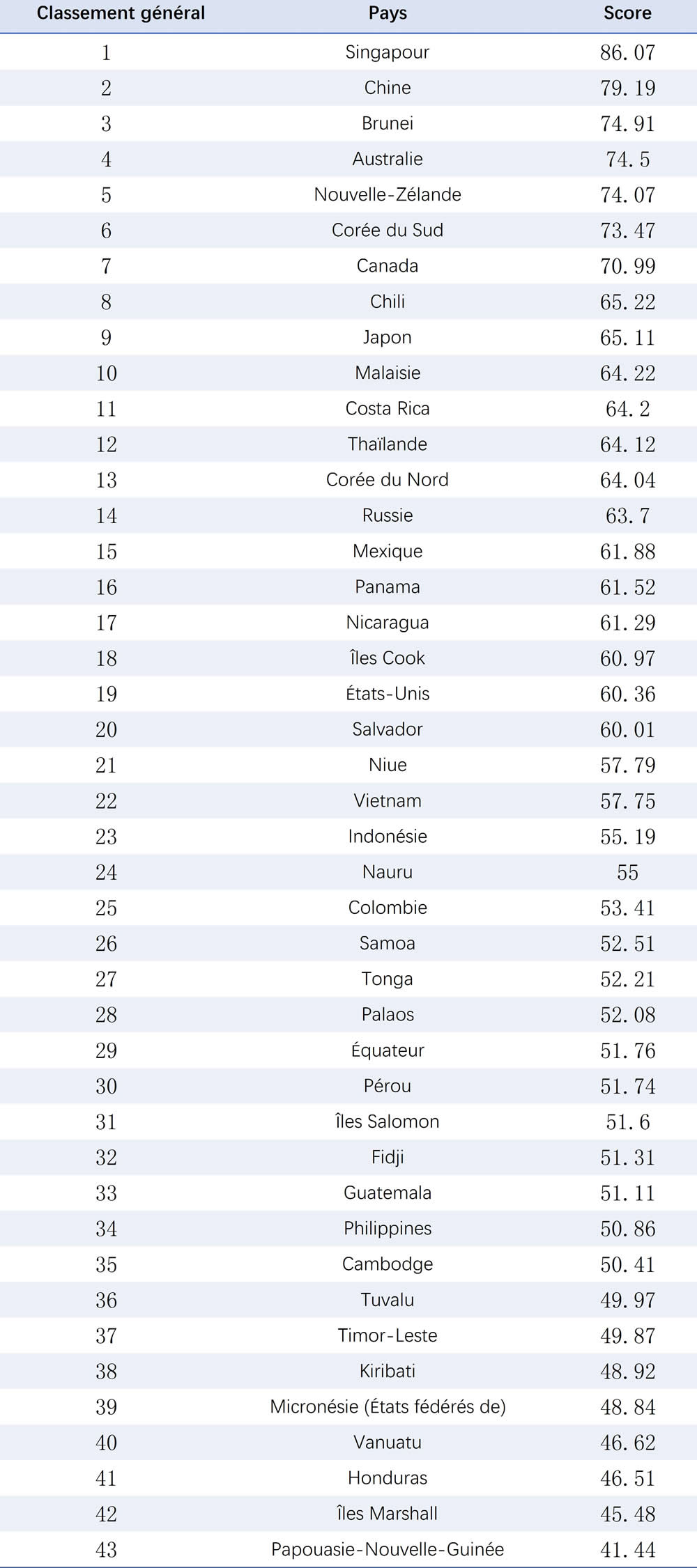 Singapour occupe la première place du classement général avec un score de 86,07 ; la Chine arrive en deuxième position avec 79,19 ; Brunei se classe troisième avec 74,91 ; l'Australie occupe la quatrième place avec 74,5 ; la Nouvelle-Zélande arrive en cinquième position avec 74,07 ; la Corée du Sud se classe sixième avec 73,47 ; la septième place revient au Canada avec un score de 70,99 ; la huitième place au Chili avec 65,22 ; la neuvième place au Japon avec 65,11 ; et la dixième place à la Malaisie avec 64,22. Parmi les dix premiers pays, six sont asiatiques, deux océaniens et deux américains.