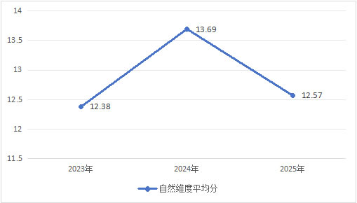La dimension Nature incarne l'harmonie entre la nature et l'humanité, reflétant l'impact des conditions environnementales naturelles et des risques de catastrophe sur la sécurité des personnes. Cela comprend des indicateurs de réponse aux changements climatiques extrêmes, de réponse aux catastrophes géologiques et de réponse à la pollution environnementale. En 2025, les indicateurs de la dimension naturelle diminueront considérablement, avec un score moyen de 12,49, une baisse significative par rapport à 13,69 l'année précédente.
