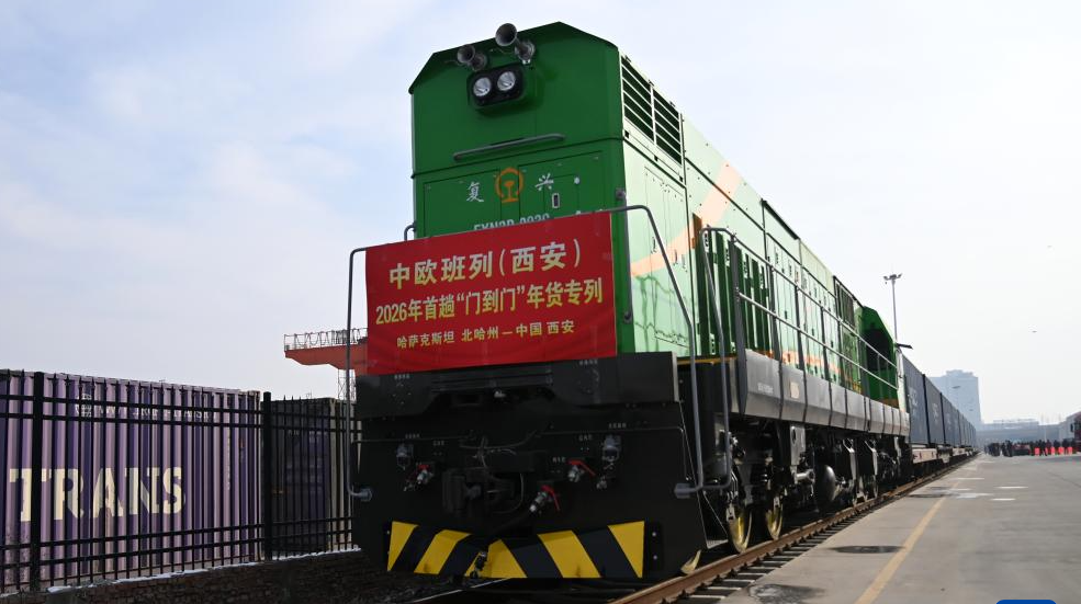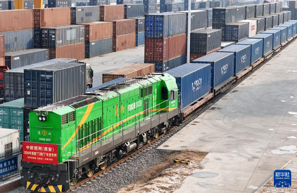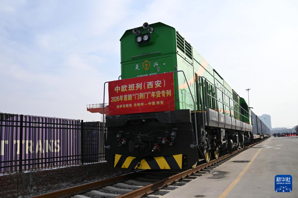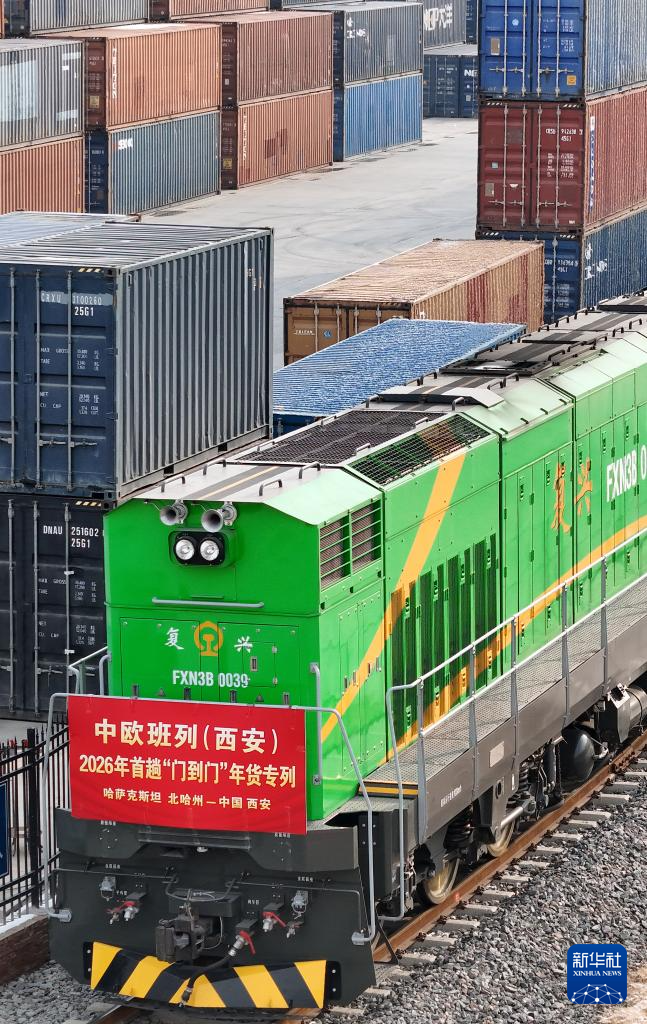 Rempli de céréales, d'huiles, de miel et d'autres produits agricoles en provenance du Kazakhstan, le premier train de fret Chine-Europe (Xi'an) « porte-à-porte » de 2026, mis en service pour la fête du Printemps, est arrivé le 21 janvier à Xi'an, chef-lieu de la province du Shaanxi (centre).