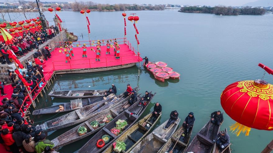 À l'approche de la fête du Printemps, le village de Mojiaqiao, près de Hangzhou, dans la province du Zhejiang (est), a organisé des activités traditionnelles de célébration. Une scène a été installée près de la rivière pour des performances de danse, d’arts martiaux et d'opéra traditionnel. Parallèlement, des activités telles que la fabrication de gâteaux de riz, l'écriture de chunlian (couplets parallèles) et la création de sculptures en riz ont été proposées sur place, créant une atmosphère festive.