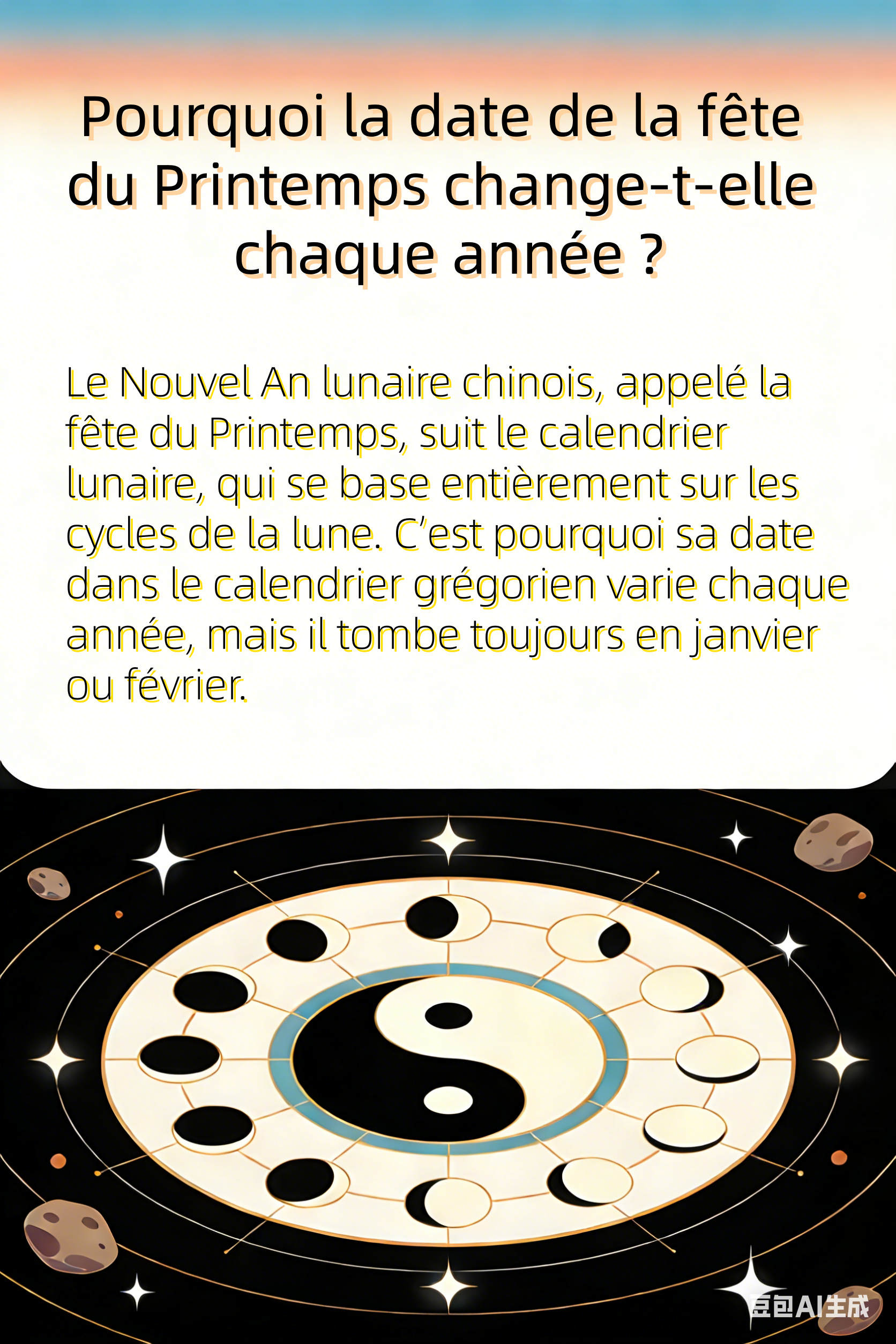 R1 : Le Nouvel An lunaire chinois, appelé la fête du Printemps, suit le calendrier lunaire, qui se base entièrement sur les cycles de la lune. C’est pourquoi sa date dans le calendrier grégorien varie chaque année, mais il tombe toujours en janvier ou février.
