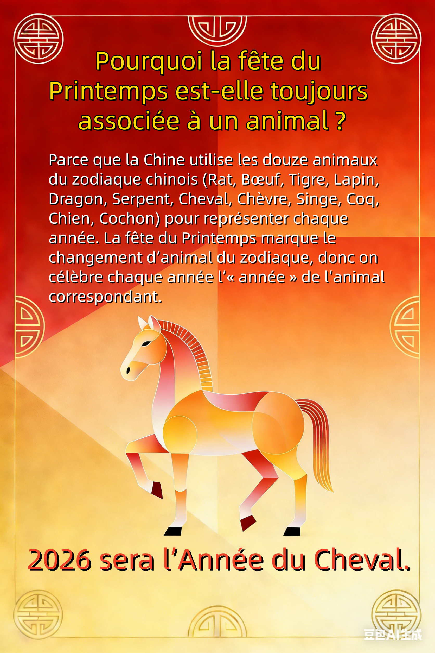 R2 : Parce que la Chine utilise les douze animaux du zodiaque chinois (Rat, Bœuf, Tigre, Lapin, Dragon, Serpent, Cheval, Chèvre, Singe, Coq, Chien, Cochon) pour représenter chaque année. La fête du Printemps marque le changement d’animal du zodiaque, donc on célèbre chaque année l’« année » de l’animal correspondant. 2026 sera l’Année du Cheval.
