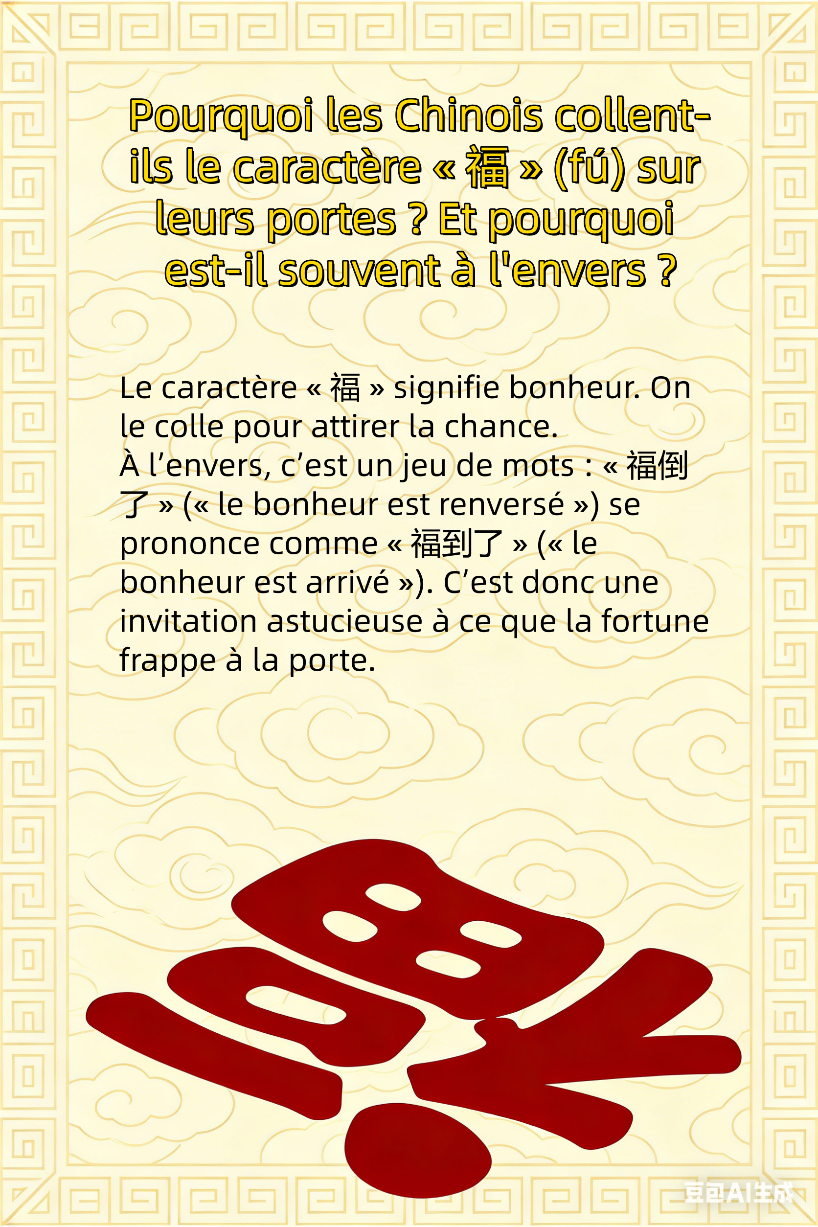 Q4 : Pourquoi les Chinois collent-ils le caractère « 福 » (fú) sur leurs portes ? Et pourquoi est-il souvent à l'envers ?