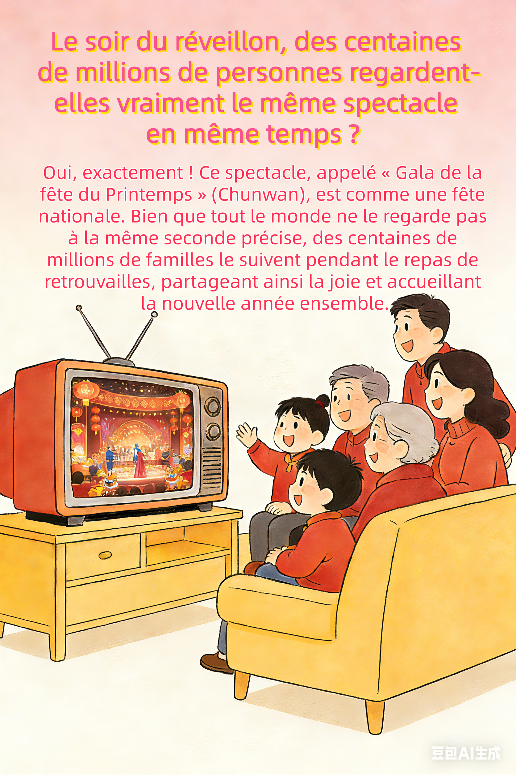 R7 : Oui, exactement ! Ce spectacle, appelé « Gala de la fête du Printemps » (Chunwan), est comme une fête nationale. Bien que tout le monde ne le regarde pas à la même seconde précise, des centaines de millions de familles le suivent pendant le repas de retrouvailles, partageant ainsi la joie et accueillant la nouvelle année ensemble.