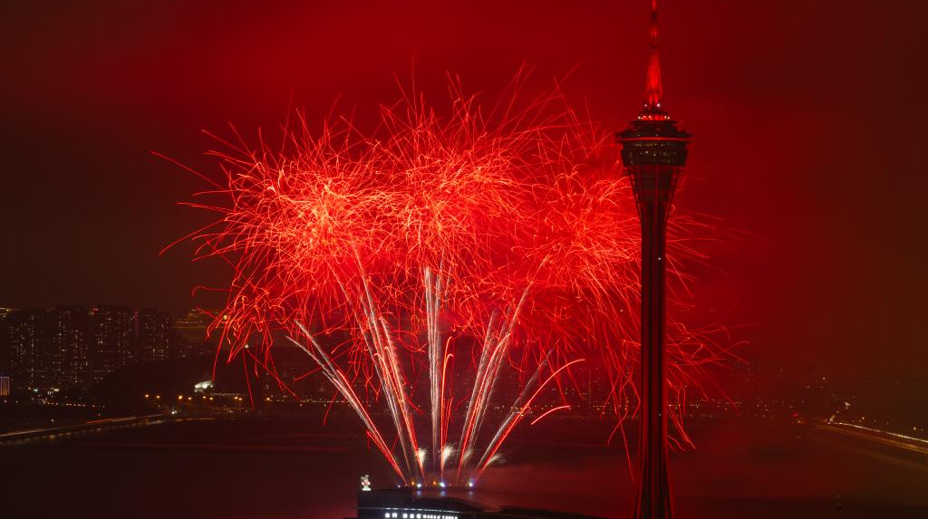 Tenue à Macao d'un spectacle de drones et de feux d'artifice pour célébrer la fête du Printemps
