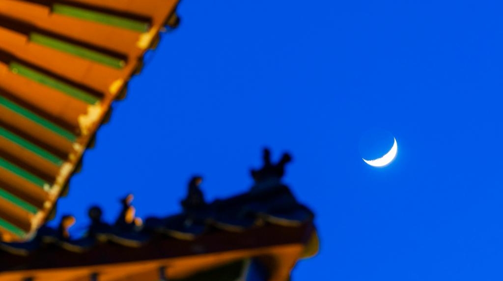 Photo prise le 21 avril 2026, montrant un croissant de lune dans le ciel au-dessus de Shuangyashan, dans la province chinoise du Heilongjiang (nord-est). Le plus grand croissant de lune de l'année est apparu dans le ciel ce 21 avril. Ce phénomène se produit lorsque la Lune est en phase de croissant tout en étant proche de son périgée, point de son orbite où son diamètre apparent est à son maximum. (Han Yang/Xinhua)