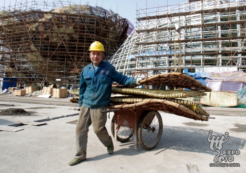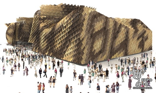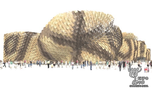 Le cadre en acier de la structure de 7000 mètres carrés, dans une position avantageuse sur la rive du fleuve Huangpu, près du pont Lupu, est couvert, ou comme les organisateurs préfèrent, «habillé» de plus de 8000 panneaux d'osier.