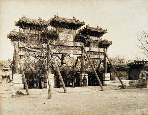 L'arc commémoratif de la porte sud de la Lamaserie Yonghe (photo prise dans les années 1900-1906 par S. Yamamoto)