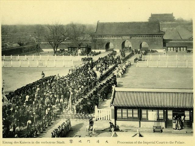Cortège devant la porte Daqingmen en l'honneur de la venue de Cixi et de l'empereur Guangxu