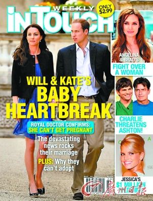 Selon le magazine In Touch, Camilla Parker Bowles aurait révélé lors d'une conversation avec des amis que Kate Middleton rencontrait des difficultés pour offrir un nouvel héritier à la famille royale, à cause de « problèmes de santé que Kate aurait eus durant son enfance, qui pourraient avoir un gros impact sur sa capacité à avoir des enfants ».