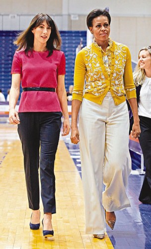 Samantha Cameron, qui a visité Washington D.C. avec son époux le Premier ministre britannique David Cameron, a participé aux « mini Jeux olympiques » avec la première dame américaine Michelle Obama. Les looks de ces deux femmes élégantes attirent toujours l'attention des médias.