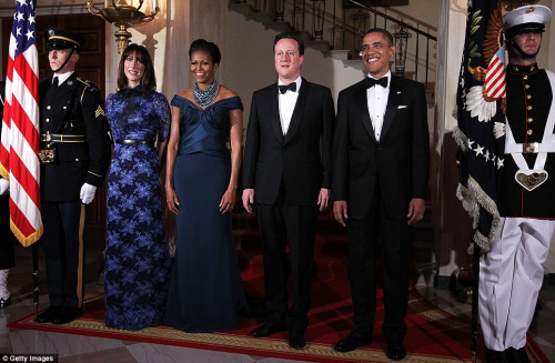 Lors du festin organisé par le président Obama pour accueillir le couple Cameron, Michelle Obama et Samantha Cameron portaient toutes deux de longues robes bleues.