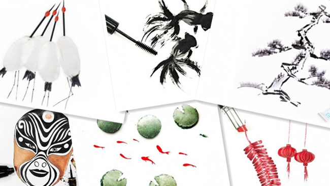 马来西亚艺术家康怡这次给我们带来的是利用口红、假睫毛、指甲油、眼影和粉底等化妆品,创作出了中国风浓郁的绘画作品,包括新年的灯笼炮竹,中国京剧脸谱等等。