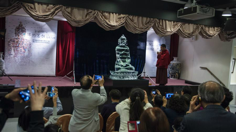 Des visiteurs prennent des photos d'une sculpture sur glace de Bouddha, fabriquée à partir d'un mélange d'eau d'un glacier de l'Himalaya et d'eau vive de Taiwan, lors d'une exposition à Taipei, le 15 février 2015. Plus de 80 œuvres d'art sur le thème du bouddhisme, de 30 artistes tibétains importants, sont présentées au public à Taipei, dimanche.
