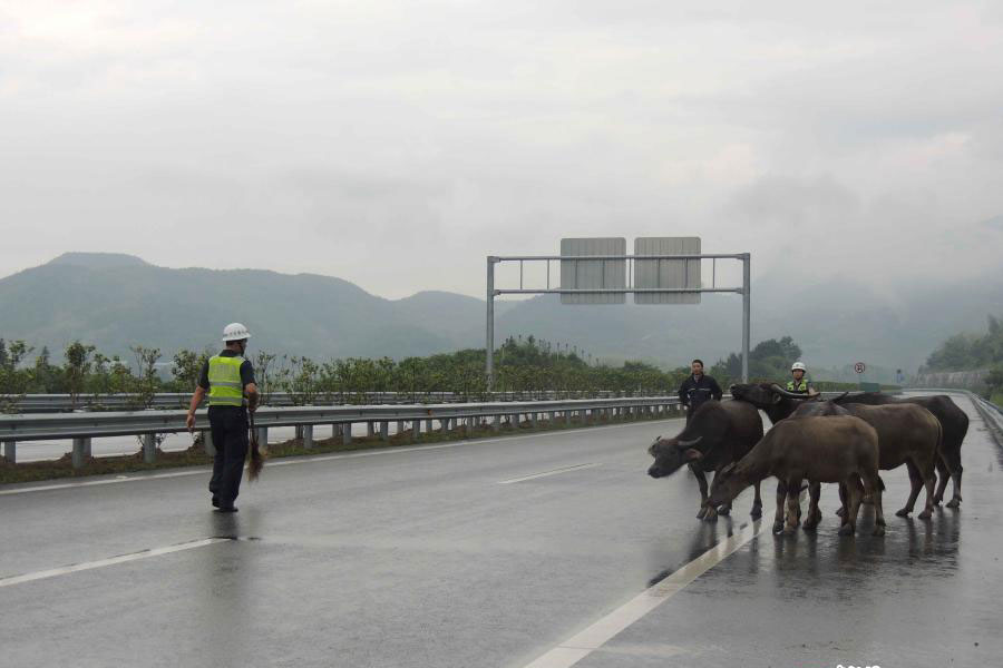 Des agents de police conduisent plusieurs buffles d'eau hors d'une autoroute dans la province du Zhejiang, en Chine de l'Est, le 27 mai.