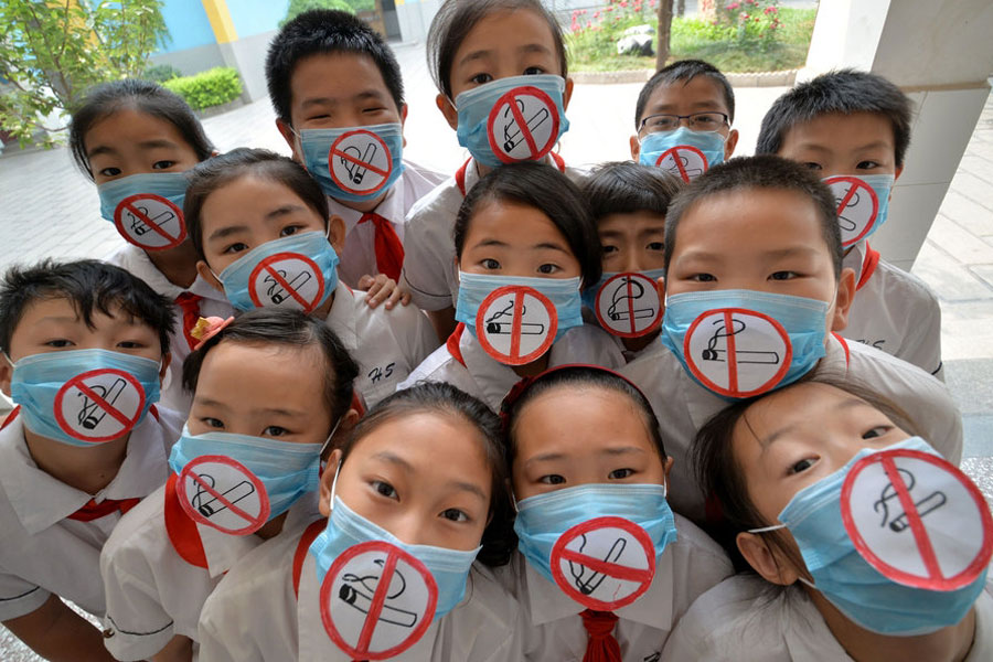 Des enfants de Handan, province du Hebei, portent des masques avec des symboles non-fumeurs, le 28 mai. Une interdiction stricte de fumer entrera en vigueur le 1er juin à Beijing, alors qu'il sera interdit de fumer dans les espaces intérieurs.