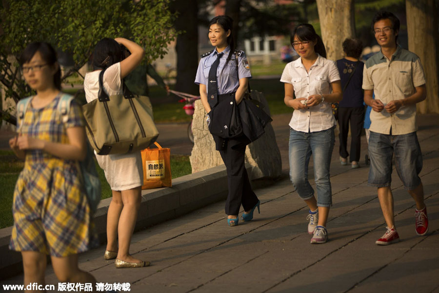 Une femme portant un uniforme de police se fait photographier à l'Université Jiaotong de Beijing, le mercredi 27 mai 2015.