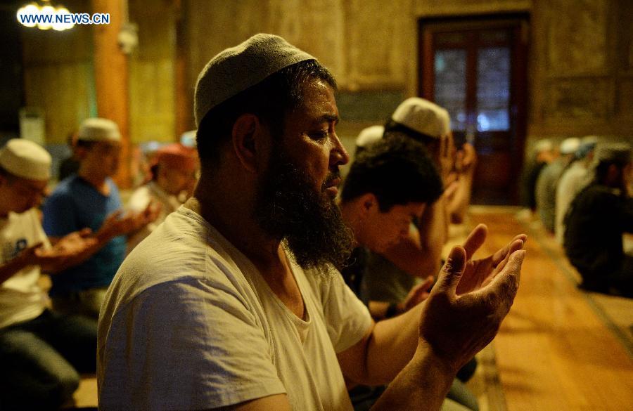 Des musulmans prient dans une mosquée de Xi'an, capitale de la province du Shaanxi dans le nord-ouest de la Chine, le 17 juin 2015, premier jour du mois sacré du Ramadan. (Photo: Xinhua / Liu Xiao)