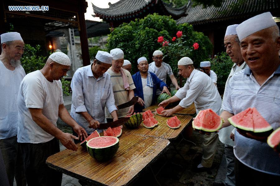 Des musulmans pendant une distribution de pastèque avant la rupture du jeûne dans une mosquée de Xi'an, capitale de la province du Shaanxi dans le nord-ouest de la Chine, le 17 juin 2015, premier jour du mois sacré du Ramadan. (Xinhua / Liu Xiao)