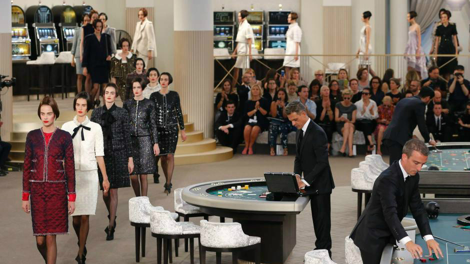 - Le 7 juillet, le défilé Chanel de la Fashion Week haute couture de Paris 2015 a eu lieu au Grand Palais dans un décor de casino. Les mannequins ont défilé autour des tables de jeu, où étaient assis les invités de marque.