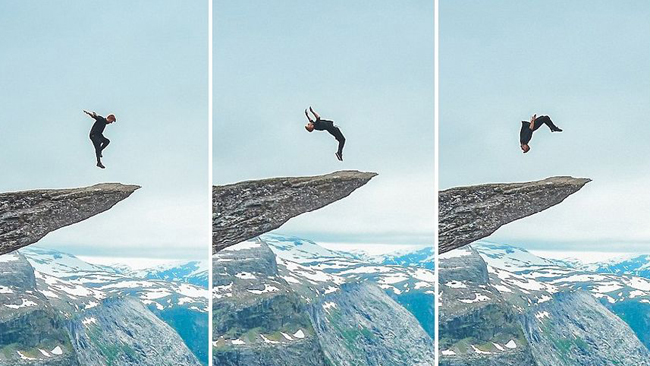 Toby Segar, un jeune parkoureur de 21 ans, a récemment fait un spectaculaire flip arrière sur la fameuse falaise Trolltunga (langue de troll) en Norvège. Située au bord du lac Ringedalsvatnet, la falaise est d'une hauteur d'environ 700 mètres.