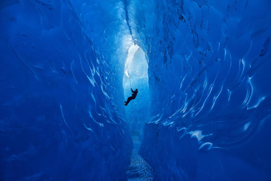 Un spéléologue dans une grotte glacière.