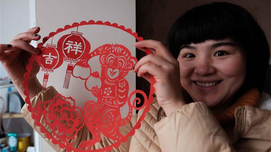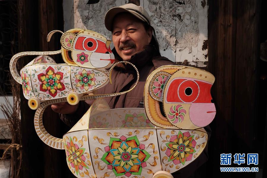 Voici des œuvres réalisées par des artisans du Jiangsu pour fêter l'arrivée de l'année du Singe: Une lanterne colorée réalisée par He Linxiang, un artisan originaire de Nantong.