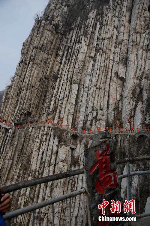 - Des moines s'entraînent au kung-fu sur la falaise Shuce du mont Song (Songshan), qui abrite le temple de Shaolin. Photo prise à Dengfeng dans la province du Henan (centre), le 17 mars 2016.