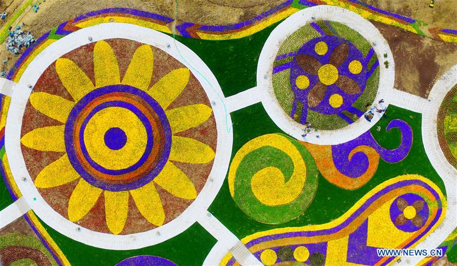 Un champ de fleurs vu du ciel, au Monde des fleurs Marco Polo de Yangzhou, dans la province du Jiangsu (Est de la Chine), le 10 avril 2016. Ces jours-ci, plusieurs parterres de fleurs installés dans le parc ont attiré de nombreux visiteurs.