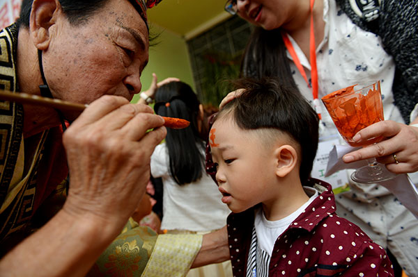 Un caractère destiné à protéger les enfants contre le mal est dessiné avec du réalgar sur le front d'un garçonnet à Chengdu, capitale de la province du Sichuan (Sud-Ouest de la Chine). [Zhang Lang / Pour le China Daily]