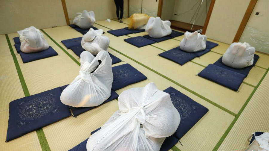 Insolite : des Japonais s'enveloppent dans une grande toile pour se détendre
