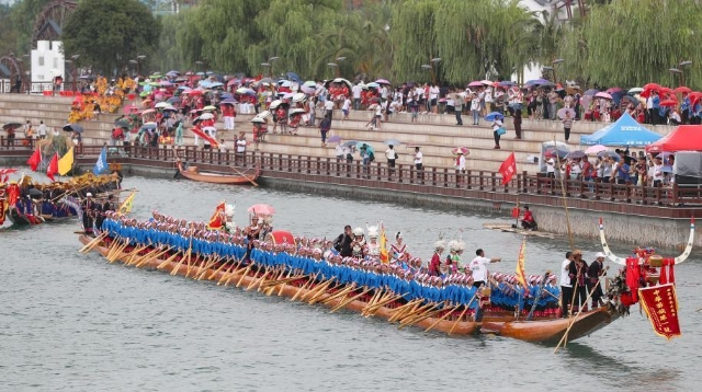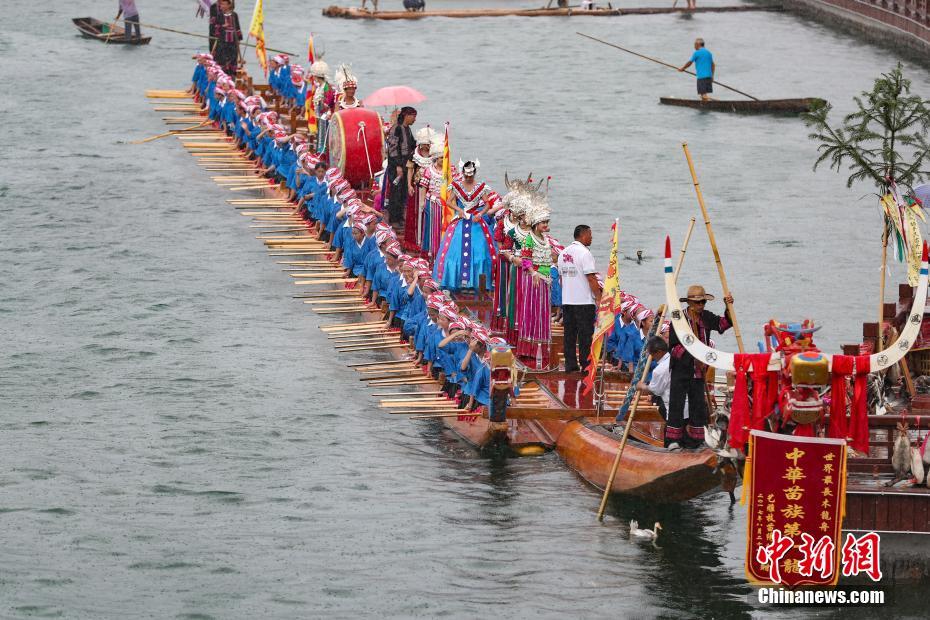 Photo prise le 28 août, montrant un grand bateau-dragon manié par 180 habitants de l’ethnie Miao naviguant sur une rivière dans le xian de Shibing, dans la province du Guizhou (sud-ouest). Il s’agit du plus long bateau-dragon en bois du monde, reconnu en 2016 par le Guinness World Records avec ses 77,8 mètres de long et 2,5 mètres de large.