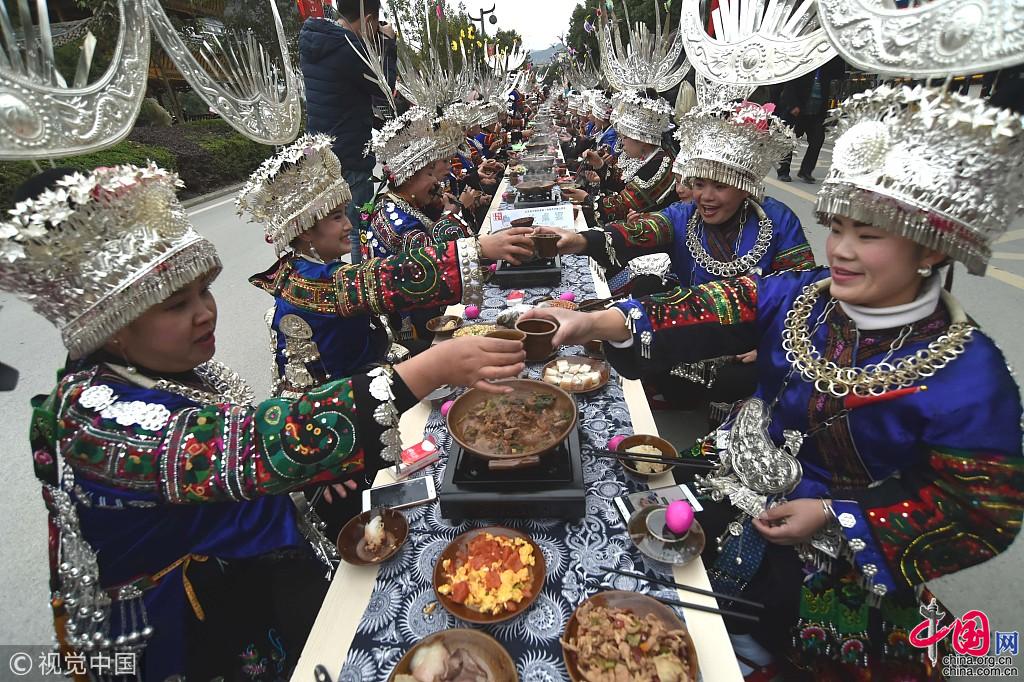 Le 23 novembre, plus de 5000 habitants du xian de Leishan, de la préfecture autonome Miao et Dong de Qiandongnan, dans la province du Guizhou (sud-ouest), se sont réunis pour fêter leur Nouvel An en prenant ensemble un immense dîner sur plusieurs tables mises bout à bout atteignant 800 mètres de long.